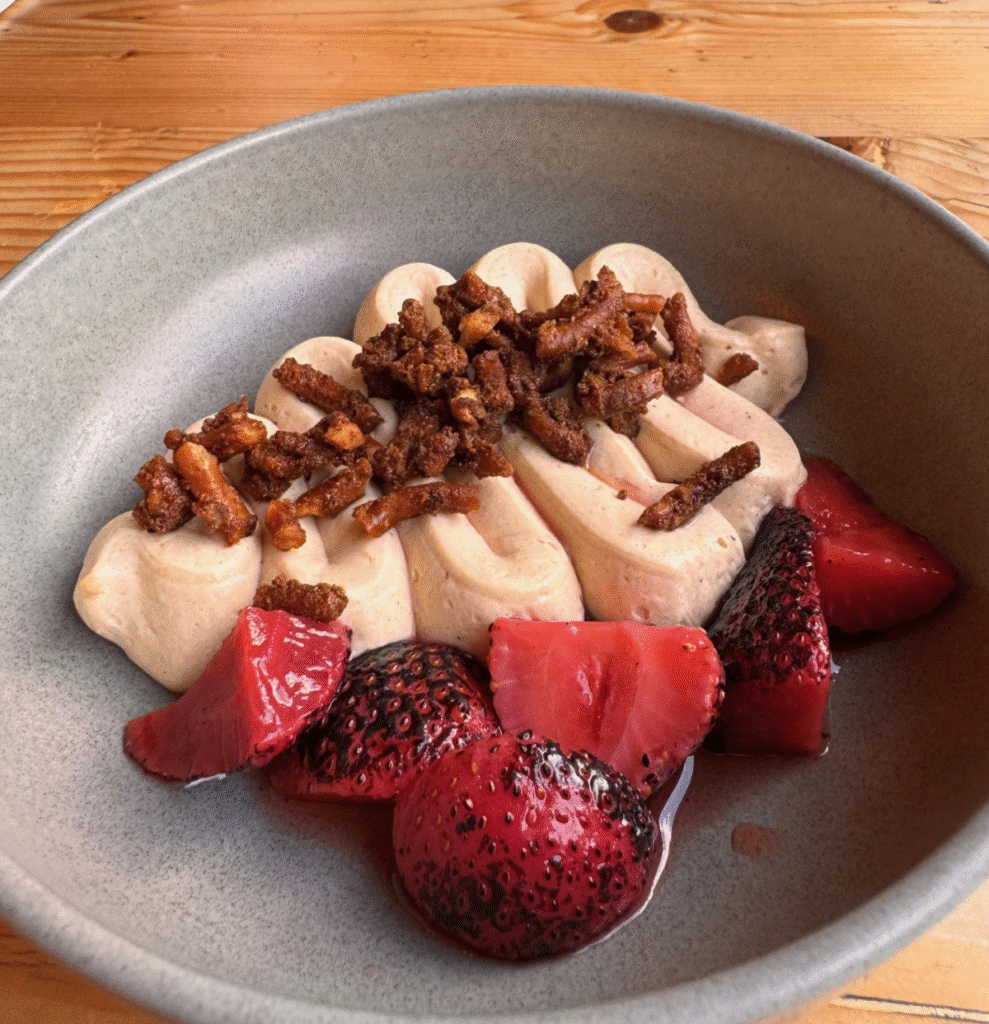 Dessert was a deconstructed take on the classic Eton mess: a strawberry mousse layered with burnt strawberries and shards of crisp biscuit. The creaminess was light and airy, the fruit carried just enough char to bring intrigue, and the biscuit snapped cleanly through it all. Familiar but elevated, it was a clever reimagining of Britain’s most chaotic pudding.